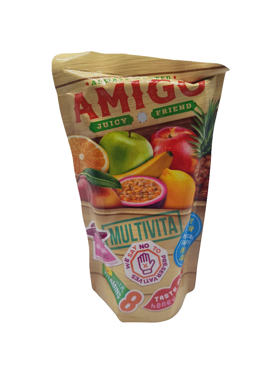 Wasser, Zucker, Apfelsaft aus Konzentrat, gemischte Konzentrate und Fruchtpürees, Stabilisatoren, Farbstoff, Vitamine, Süßungsmittel.